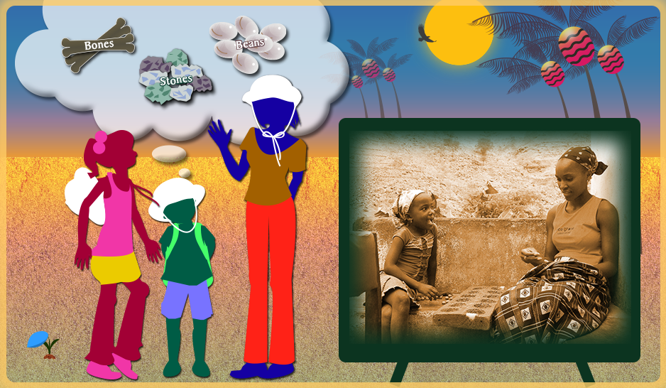 マンカラは身近にある種や石、骨を使って得点を競うゲームよ。シンプルなルールで小さな子供でもすぐに遊べるようになるの。