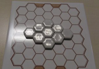 ゲーム開始時は、右写真のように、ボード中央に印刷がある9マスに、6角のスペースタイルを配置しておきます。