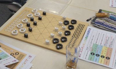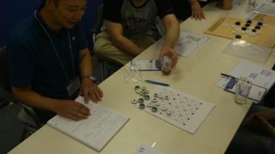 ゲーム時間が長いため、前回参考出展となった「ユニオンキング」ですが、今回は発表枠を広げて50分程説明と、実際のプレーをしてみました。前回発表を受けて、複雑なルールのユニオンキングを単純化したゲームの「ユニオンキングもどき(仮題)」を山本さんが発表して、ユニオンキングの魅力と課題について議論が盛り上がりました。