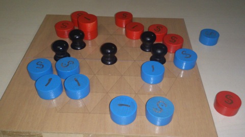 第7回に山本さんによって、発表された、Sky Scrapers。その際の研究会で、初期配置を固定するのではなく、プレーヤーが任意に配置するところからゲームにしてはどうかという意見に、ボード(=地形)をさまざまに変形したバージョンを用意した派生ルールを紹介されました。プレーすると、こちらの方がずっと複雑で戦略的です。前作は、初期配置の性質上、自分の手に主に集中していればよかったため、パズル色が強かったのですが、地形上の優位な位置をどのように確保するか、駒の配置から悩めます。配置ごの手順で、大きく逆転してしまうこともしばしばあり、とてもスリリングなゲームになりました。