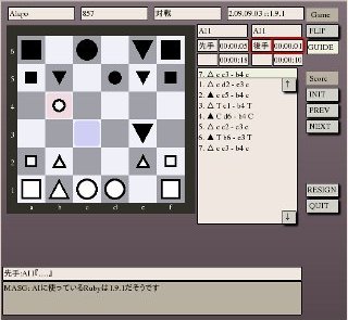 フロントエンドはFlexで記述、バックエンドにJava+RDBMSを使ったAIです。これまで公開していたRubyのAIに対して、高速になり深読みができるようになっています。期間中のAIは、ゲーム木を用いたAIのみ公開しています。開発中のバージョンでは、モンテカルロ法なども取り入れた、能力の高いAIを実現すべく研究を進めています。