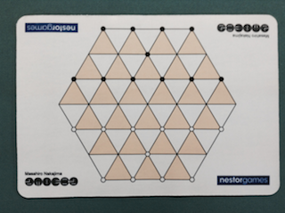 左図の、Hex形状のボードを使います。初期配置は、右図のように各プレーヤーの色の駒を交点上に配置します。