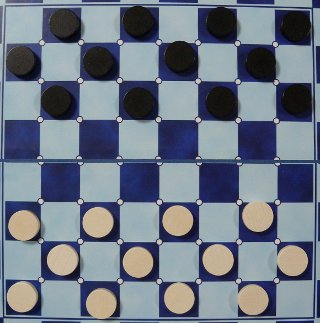 各プレイヤーは12個(English Draughts (American Checkers / Straight Checkers)などの場合。ゲームによって8個、16個、20個、30個など)の駒("men")をもち、8x8, 10x10, 12x12のいずれかの盤を用いて、ゲームをスタートします。