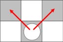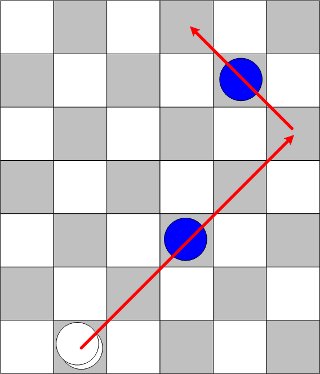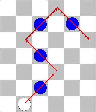 駒の動きはすべて斜めです。(ですので、ゲーム進行中ずっと、盤の黒マスしか使用しないことになります。) Kingに昇格するまで斜め前に一マスしか進めません。 開いているマスにのみ、移動することができます。