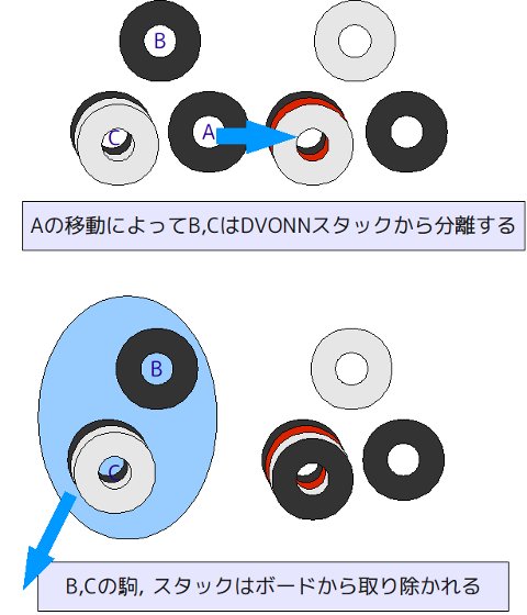 単独駒も、スタックも、ボード上で、少なくとも1つのDVONN駒、またはDVONN駒を含むスタックと直接接するか、他の駒やスタックが間に入る形で間接的につながっていなければなりません。 DVONN駒、またはDVONN駒を含むスタックとの間が、空きスペースで分断されてしまったら、切り離されたすべての駒、スタックは、盤上から取り除かれます。