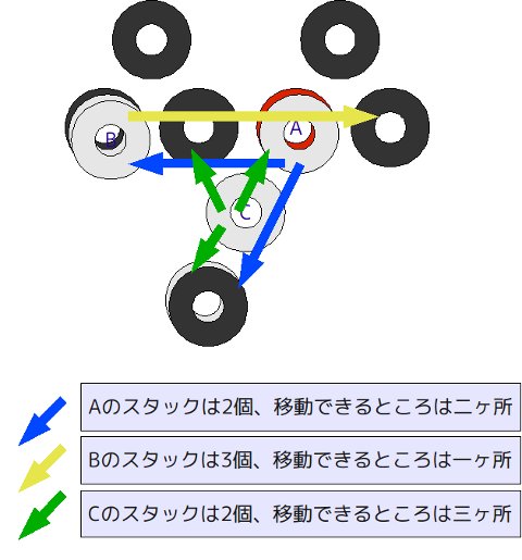 駒を積んだ形をスタックと呼びます。スタックの頂上に自駒を置くことで、そのスタックを制圧することができます。 互いの初手ではまだスタックがないので、盤上の自分の駒のうちのいずれかを自分または敵の駒の上に積む(=スタックする)ことから始めることになります。