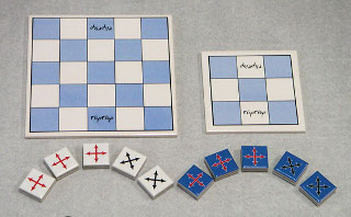 それぞれのプレーヤーは3(5x5のボードでは5)個の駒を所有します。 各駒は、+(将棋の飛車/ChessのRook)と×(角行/Bishop)の二面があります。