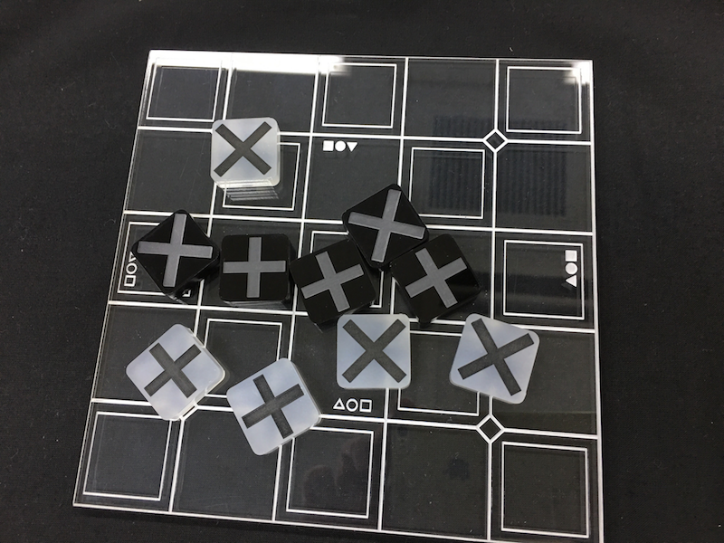 A 5x5 board, 4 white pieces and 4 blue pieces. See below Fig. Pieces are double-faced: A red cross is shown on one face and a black cross on another.