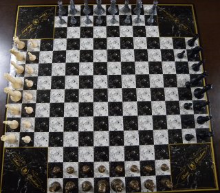 写真のようなボードを使い、セットアップします。 盤は、通常のChessボードの4辺に、エクステンションがついたものを使用します。Verneyのバージョンは写真と同じく8x3ですが、8x2 や 8x4の拡張盤を使うこともあります。