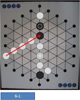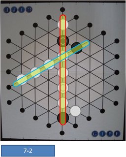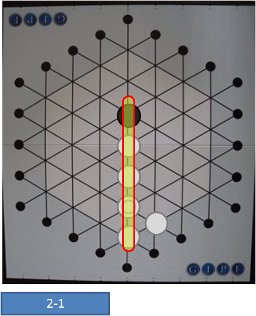 占拠されている交点に駒を進めるときは、すでにあった駒を進行方向に1つずらします。ずらしたい方向に他の駒が2個、3個…と連なって置かれていた場合は、それらの駒も同じく1つずつ進行方向にずらします。