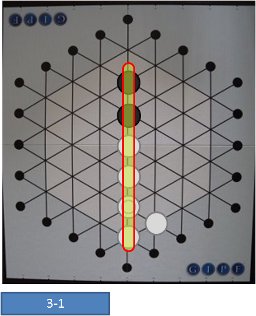 さらに、同色で並んだ4駒の前後に、他の駒(白でも黒でも)が間をおかずに連なって置かれている場合(Fig.2-1, Fig.3-1)、それらの駒も盤上から取り去られます。隣接していても、4つ同色がそろっていない駒は、取りません。(Fig.3-2: 同色で4つ並んだ中に含まれていたGIPF駒を盤上に残しておいた場合です。)