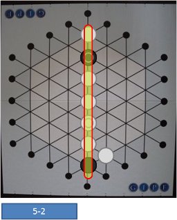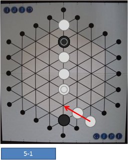 白駒の動き(Fig.5-1)の結果、白は1つまたは3つの黒駒を捕獲し、4つまたは6つ(GIPF駒については、取り去るか残すか選択できます)の自駒をリザーブに増やすことになります(Fig.5-2)が、盤上からは4つまたは6つの自駒を失うことになり、盤上での勢力はそれだけ弱くなります。