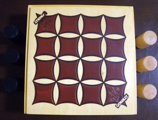 写真のように、初期配置は、白黒それぞれ3組に、駒をすべて中に入れた状態で開始します。