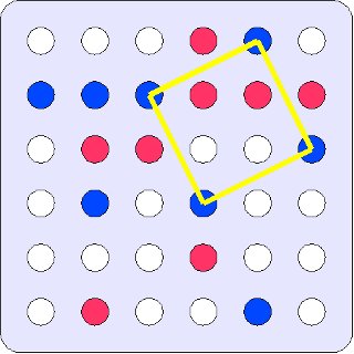 自分の手番において、自分の色の四点を結んだ四角形に、一つでも正方形が出来上がってしまったら、負けになります。できる正方形は、斜めに傾いていても、どのようなサイズでも、正方形とみなされます。