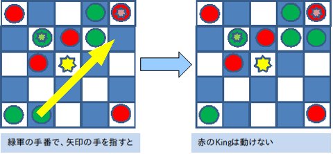 右図のようにKingが敵駒に囲まれて動けなくなったら負けです、必然的に囲まれたプレーヤーに勝ち目がなくなりますので、 負けになります。*4