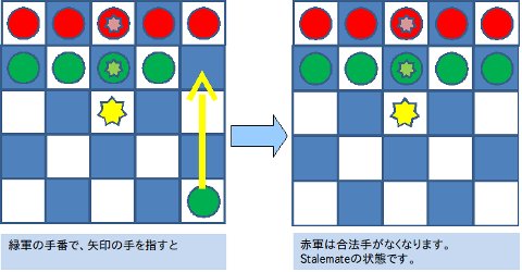 下図は、お互いが協力しあわないと現れない局面ですが、手番プレーヤーに合法手がない状態になった場合も、手のないプレーヤーの負けです。