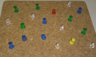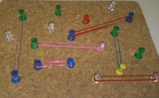 紙と鉛筆を使って遊ぶこともできます。写真は、コルクボードとピン、そして輪ゴムを使って遊んでいる例です。