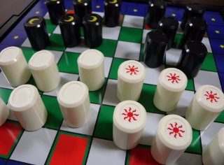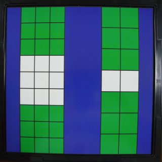 1992年に考案されました。セルゴという1975年に発売されたゲームを原型に、改良されたゲームだそうです。各プレーヤー、12個ずつ駒を持って開始します。先に"5個並べ"という、自駒で直列の配列を作ることを目的としたゲームです。駒に通常状態と成りの状態があり、駒の働きが変わる特徴があります。