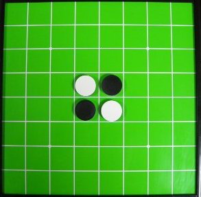 オセロでは必ず黒白が対角線(上写真)となるように置かれますが、リバーシでは平行に置いても構いません。