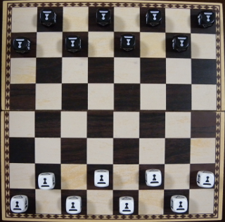 8x8のボード上に、各プレイヤーはそれぞれ8個の自分のピースを、Pawnを上にして、自陣(=自分に近い1段目と2段目)の黒いマスに、写真のように初期配置します。