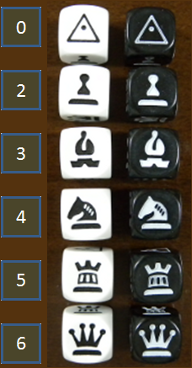 各ピースの6面は、それぞれ、Pyramid, Pawn, Bishop, Knight, Rook, Queenの駒になっています。それぞれの駒には0点から6点までの配点がされています。