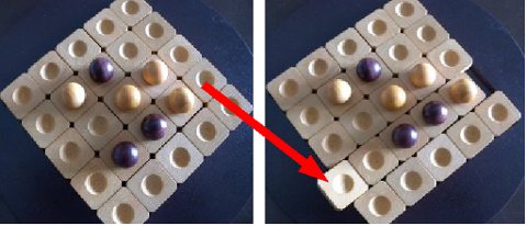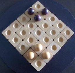 ボードの正方形の対角線を挟んで、それぞれのプレーヤーが座ります。 ボードのへこみ部分にスクウェアピース25個すべてを敷き詰めます。 ディスクの配置が終わったら、自分の駒を写真のように配置します。