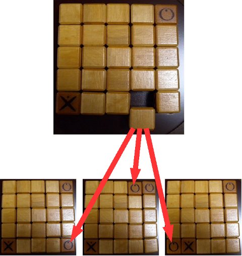 外側の16個のキューブのうち、自分のシンボル・キューブのいずれかを抜き取り、抜き取ったキューブを次の3つのいずれかの場所に押し込むことで、配置換えをします。抜き取った場所に、キューブを戻すことはできません。