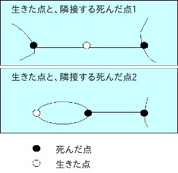 点からまだ線が3本出ていない点を、生きている点と呼び、3本出ている点を死んだ点と呼ぶことにします。