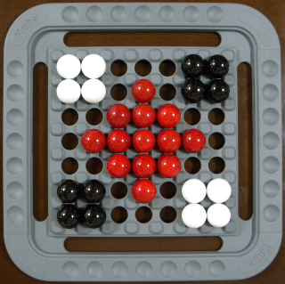 白、黒8個ずつのマーブルと、13個の赤のマーブルを、7x7の穴の開いたボード上に写真のように配置します。