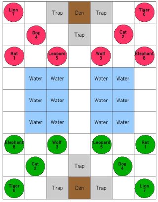 | Tiger(虎) | 6 | 水を対面まで飛び越えられます。ジャンプした先の動物を捕獲できます。鼠が水中の通過点に居るときはジャンプできません。 |