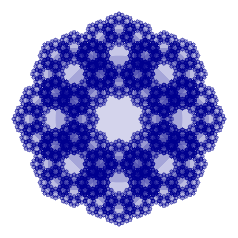 右の図は、プログラムによって描いた図形です。描き方は、各階層の円を描き、一つしたの階層に8個の円を機械的に配置する作業を再帰的におこなっています。そこで、図を良く見てください(クリックすると拡大します)。場所によって、円の色が濃くなっているところがあります。まるで、円盤を積み重ねたように見えるかと思います。プログラムで描く円は、半透明処理が施してあるので、繰り返し描かれた位置が濃く浮き出るように描かれています。