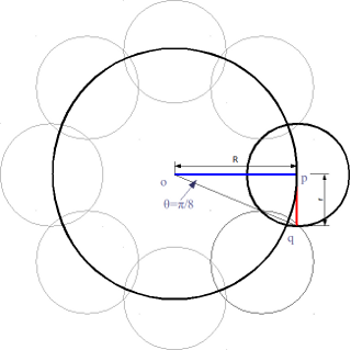 左の図の、大きな円の半径Rで、外周に配置した円の半径rを表してみましょう。 外周の円の中心を結ぶと正八角形になります。また、図の、pqは、小さな円の中心を通る大きな円の接線です。この接線をそれぞれの円について引いてできあがる図形は、正八角形です。ですので、角poqは円周の1/8の半分ですので、θ=π/8 です。 ということで、