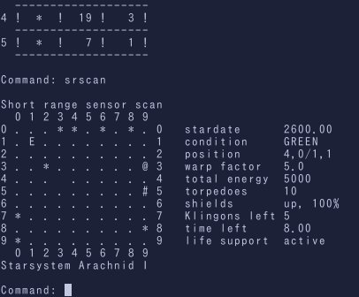 銀河は、8x8のQuadrantで構成され、一つのQuadrantは10x10のSectorで構成されています。 あなたは、与えられたミッション=一定期間のうちにKlingonを掃討することを達成しなけれ ばなりません。