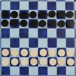 8x8の盤とChecker駒(黒白16個ずつ)を使い、図のようにセットアップします。