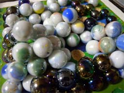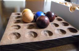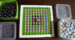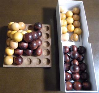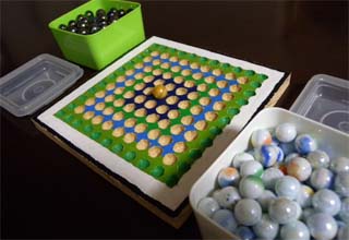 11x11ぐらいが最も面白いと言われています。写真の9x9ボードは、当初11x11にするつもりだったのですが、米国で販売されていたビー玉の品質が悪く、大きさや形が不揃いで、11x11ではゲームの途中で山が崩れてプレーに集中できないため、やむなく9x9にしたのです