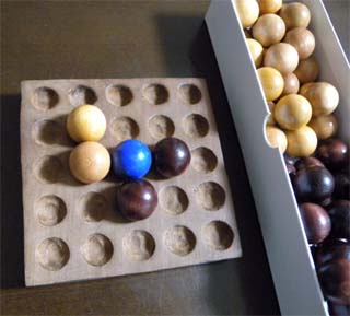 オリジナルのゲームは絶版で、ほとんど手に入りません。米国発と言われているこのゲームですが、そもそもあまり売れなかったのか、館長の8年程の米国滞在中も見たことがありません。ですので、ほとんどの人は、ボードを自作して遊んでいるようです。写真も、5x5, 9x9のボードは館長自作の物です。