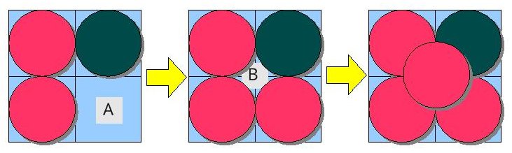 自分の玉を置いた結果、その玉を含む四個の領域に玉が置かれた状態になり、その内三個以上を自分の色が占めている場合は、その四個の玉の上にもう一つ自分の玉を同じ手番の中で置きます。その結果、置いた玉で四個の玉が置かれた状態ができて、同じように三個以上を自分の色が占めているなら、同じ手順を繰り返します。