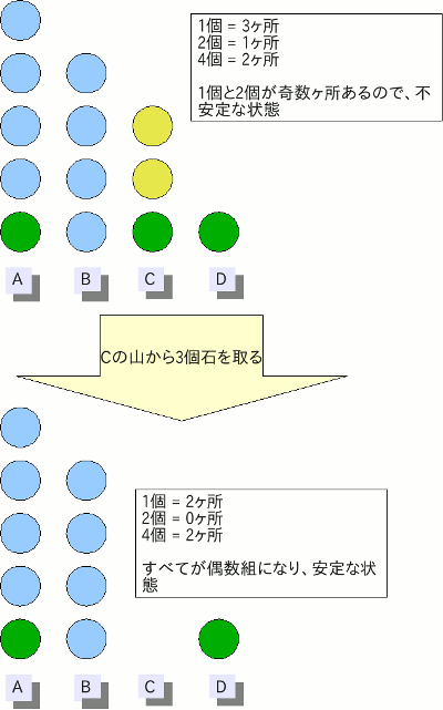 正型のnimでの必勝手順は、それぞれの山を二のべき乗個にべき数重ならないように分類し、 すべての山について同じべき数を持つものの合計が、いずれも偶数個になるように石を取って いきます。この状態を安定な状態と呼びます。