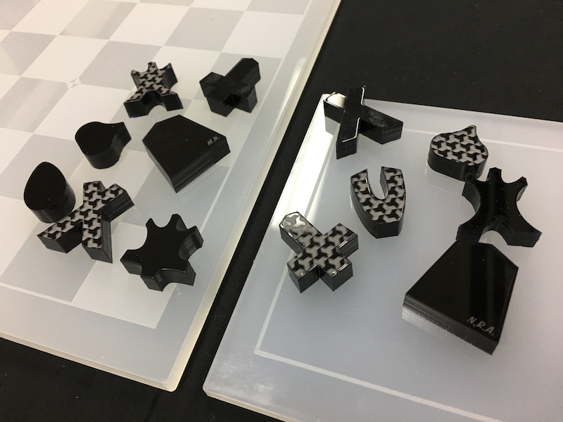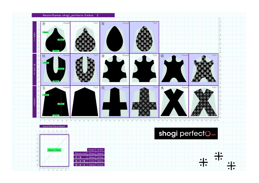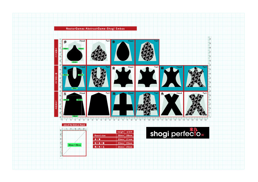 世界中で広く・長い間遊ばれ発展してきたChessと将棋の仲間。1)駒に働きを与える、2)チェッカーパターンのボード、3)持ち駒再利用は、Chessと将棋の仲間のボードゲーム史における大イノベーションです。一方で、各地域で伝承・発展した、いずれのChessと将棋の仲間も、フィギュア化された駒や文字で意味を表す形で、ゲームのルールとは異なるモチーフ*1があります。ですので、Chessと将棋の仲間をアブストラクトゲームに加えたくない、という意見もあります。shogi perfectoは、Chessと将棋の仲間による大イノベーションへの敬意と、すばらしいアブストラクトゲームである証としての、Néstorとアブストラクトゲーム博物館からの返礼です。